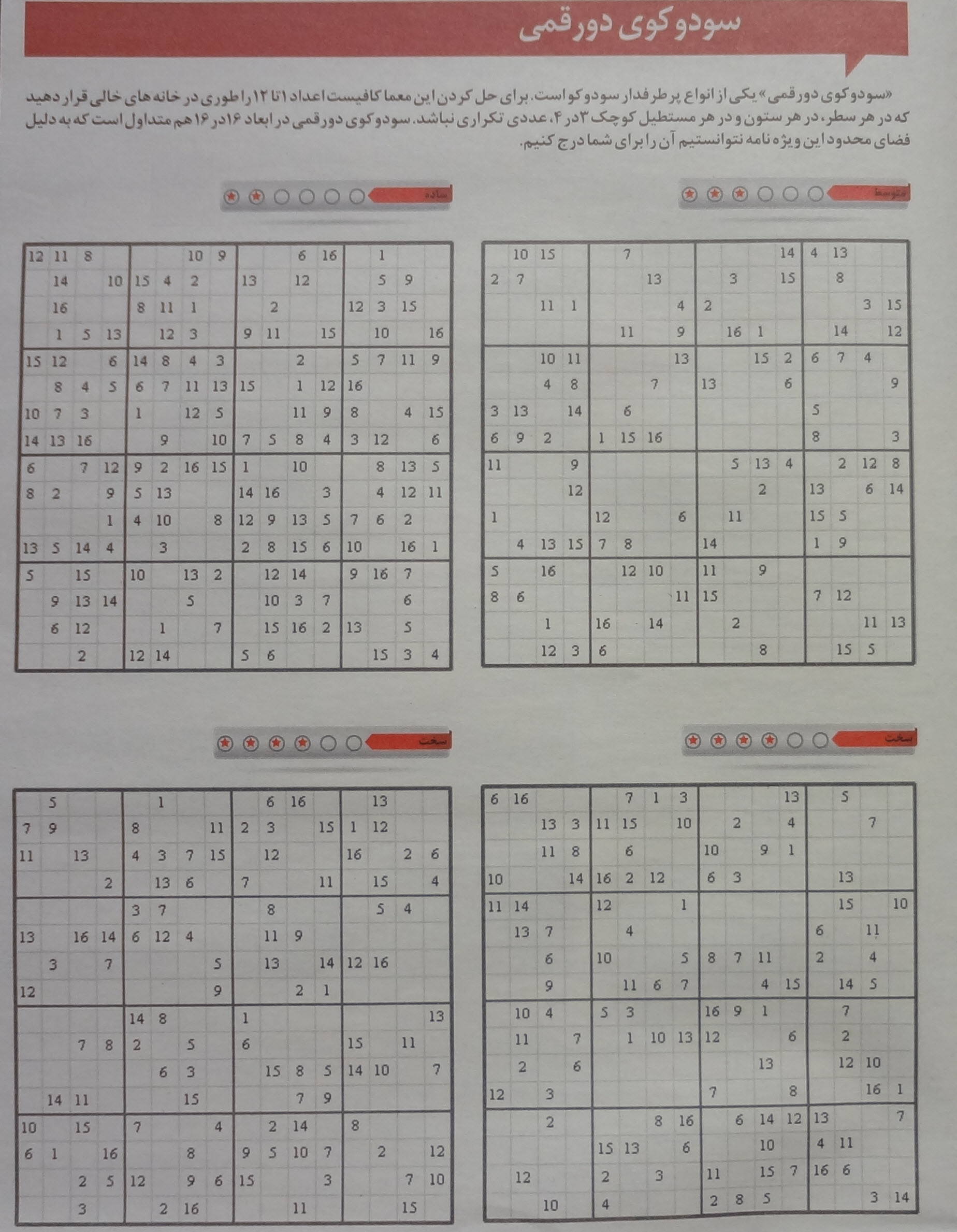 من هم این صفحه رو مروری کردم و دیدم ای دل غافل، سودوکو 16×16 (Hex Sudoku) داده شده و اشتباهی عنوان شده که سودوکو 12×12 است!! ای کاش تیم طراحان 6و7 قدری فنی تر به قضیه نگاه کنن.......