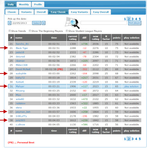 در حال حاضر 5 شرکت کننده فعال ایرانی در این لیگ داریم که در مسابقه دیشب، همگی موفق بودند و در جدول کلاسیک رکوردی بین 2 دقیقه تا 4 دقیقه ثبت کردند و من وقتی نتایج رو مرور کردم و اسامی دوستان رو دیدم حسابی خرسند شدم و تصمیم گرفتم تصویرش رو بزارم رو وبلاگ.