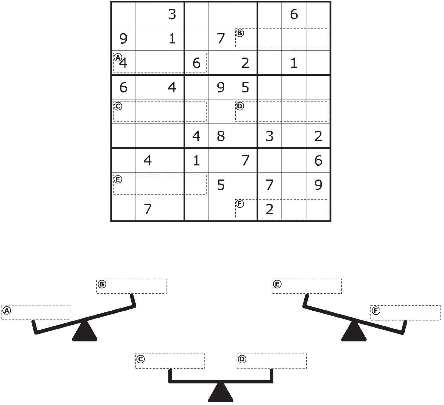 قانون سودوکوی کلاسیک را اعمال کنید. علاوه بر آن، چند ناحیه در جدول به صورت خط چین مشخص شده اند و اندازه (مقدار) آنها در کنار جدول داده شده است که باید در حل آنها را لحاظ کنید. وزن قابها و کفه های ترازو را نادیده بگیرید.