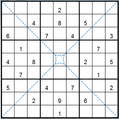 قانون سودوکوی کلاسیک که پابرجاست، علاوه بر اون، 4 تا ناحیه قطری به صورت خمیده داریم که اون ها هم 9 خانه ای هستند و در یک خانه مشترک هستند و باید اعداد 1 تا 9 تو این 4 ناحیه هم بدون تکرار باشند.