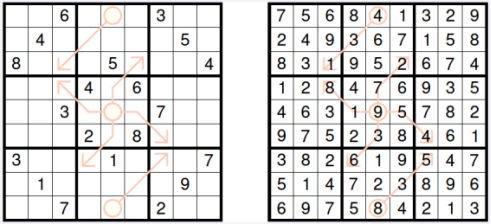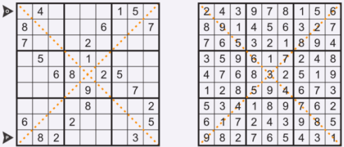 قانون حل: اعداد 1 تا 9 را طوری در خانه های جدول قرار دهید که هر عدد تنها یکبار در سطرها، ستون ها، مربع های کوچک 3 در 3 و قطرهای اصلی جدول، تکرار شود.
