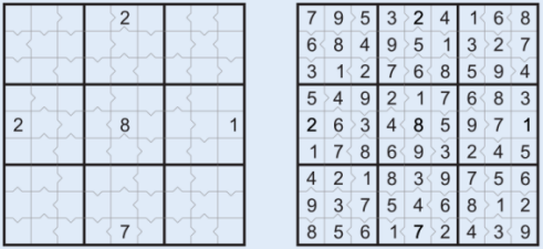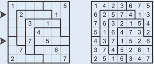 قانون حل: اعداد 1 تا 7 را طوری در خانه های جدول قرار دهید که هر عدد تنها یکبار در سطرها، ستون ها و نواحی نامنظم پررنگ شده، تکرار شود.