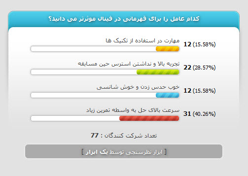 در نظرسنجی دوم هم از شما در مورد عامل موثر در موفیت در فینال پرسیده بودم که نتایج آن به شرح زیر است: