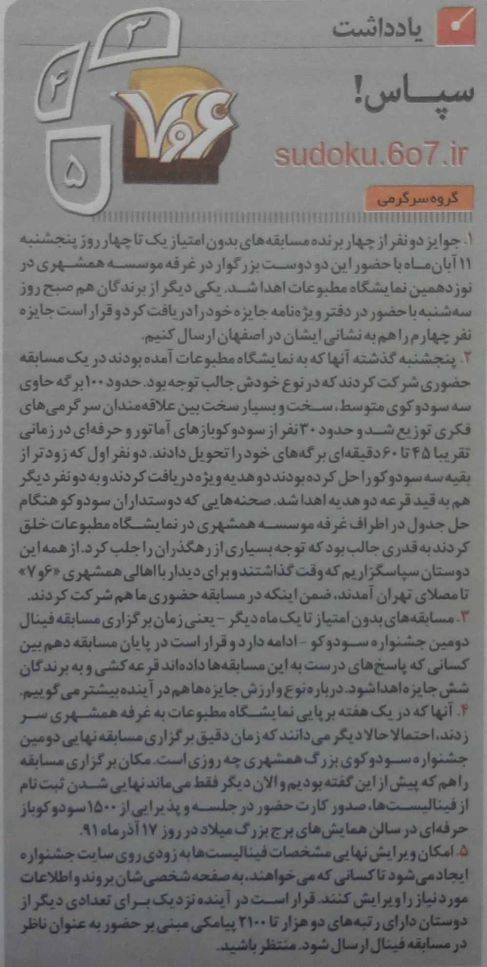 همانطور که هفته گذشته هم در این وبلاگ اطلاع رسانی شد، فینال دومین دوره جشنواره سودوکوی همشهری در تاریخ جمعه 17 آذر 1391 قرار است با حضور 1500 سودوکوباز در سالن همایش های برج میلاد برگزار گردد، خبری که این هفته در ستون اخبار ویژه نامه هم قرار گرفت تا رسمیت پیدا کنه. اتفاقی که باعث شده من هم روزشما برگزاری فینال سودوکو را در گوشه سمت راست وبلاگ قرار دهم، تا هر وقت و هر لحظه ای که به وبلاگ سودوکو وارد می شوید، از زمان برگزاری فینال غافل نشوید!!